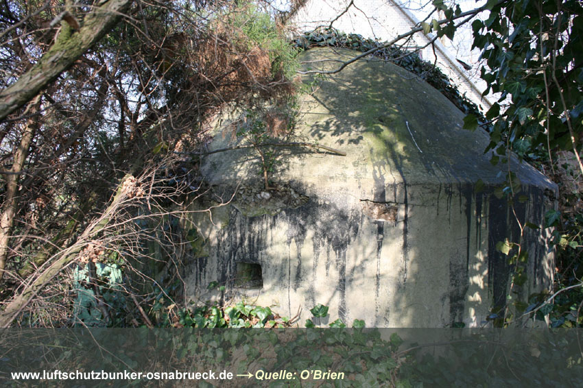 Bilder eines verschütteten Erdbunkers am Hunteburger Weg Ecke Ickerweg konnten eingefügt werden. Dieser privat errichtete Luftschutzraum befindet sich unweit östlich der ehemaligen Teuto-Metallwerke. Er diente den Bewohnern der anliegenden Häuser und des Gehöftes nördlich als Schutz. Der Erdbunker ist nicht mehr zugänglich und wurde wohl bald nach dem Krieg zugeschüttet. Es könnte auch sein, dass das Bauwerk gesprengt wurde. Aufgrund der Teuto-Metallwerke wird die Errichtung des Bunkers erfolgt sein, da um das Werk herum ständig mit Luftangriffen gerechnet wurde. Hier Dank an unsere Partnerseite www.untergrundosnabrueck.de. Brandwache nachgewiesen: Es handelt sich bei diesem Objekt um eine gemauerte Brandwache / Brandwachenstand / kurz BWS auf dem Gelände der alten Caprivikaserne. Der Unterstand befindet sich im südlichen Bereich des Geländes nahe der alten Offiziersunterkünfte und ist heute teilweise überbaut. Die Sichtscharten wurden nach dem Krieg offenbar durch die Briten versiegelt. Sehr selten wurden in Osnabrück Brandwachen errichtet - die nachgewiesenen Bauten nur im militärischen Bereich. Dies scheint die letzte existente Brandwache Osnabrücks zu sein. Hier Dank an unsere Partnerseite www.untergrundosnabrueck.de. |