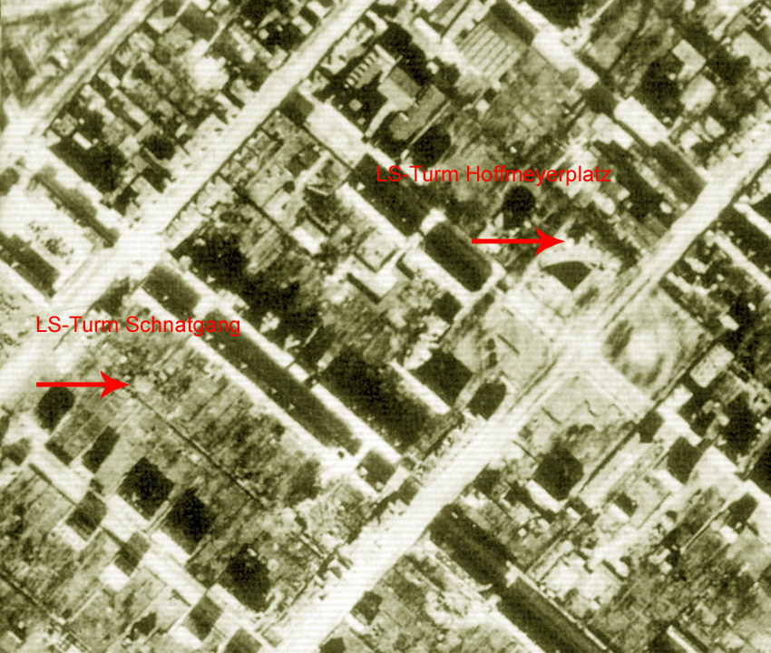 Heute fand ein Treffen mit unseren Kollegen aus Osnabrück vor Ort in "der verbunkerten Stadt" statt. Danach ging es weiter nach Ibbenbüren, dort sind ebenfalls noch immer LS-Anlagen vorhanden. Von links nach rechts: H. Haubrock, A. O'Brien, H. Raddatz Ab sofort sind unsere Seiten auch über die Adresse www.luftschutzbunker-osnabrück.de zu erreichen! Immer wieder ist von einem zweiten LS-Turm am Hoffmeyerplatz in Osnabrück die Rede. Der Turm soll gegenüber des bekannten LS-Turmes (heute noch als gesprengte Ruine erhalten) an der Ostecke des Platzes gestanden haben, nahe an Wohnhäusern. Er soll deshalb nicht gesprengt worden sein können. Ab 1976 soll der Turm abgerissen worden sein. An die beschriebene Stelle wurde nach den Hinweisen auf das Fundament ein runder Sandkasten gebaut, der wiederum kürzlich entfernt wurde. Was ist an diesen Hinweisen dran? Wer hat Infos? Stand dort wirklich ein zweiter LS-Turm? Das Kuriose: Auf Luftbildern von 1945 ist an dieser Stelle definitiv kein zweiter LS-Turm zu erkennen. An der Ostecke des Hoffmeyerplatzes ist 1945 kein Luftschutzturm erkennbar... |