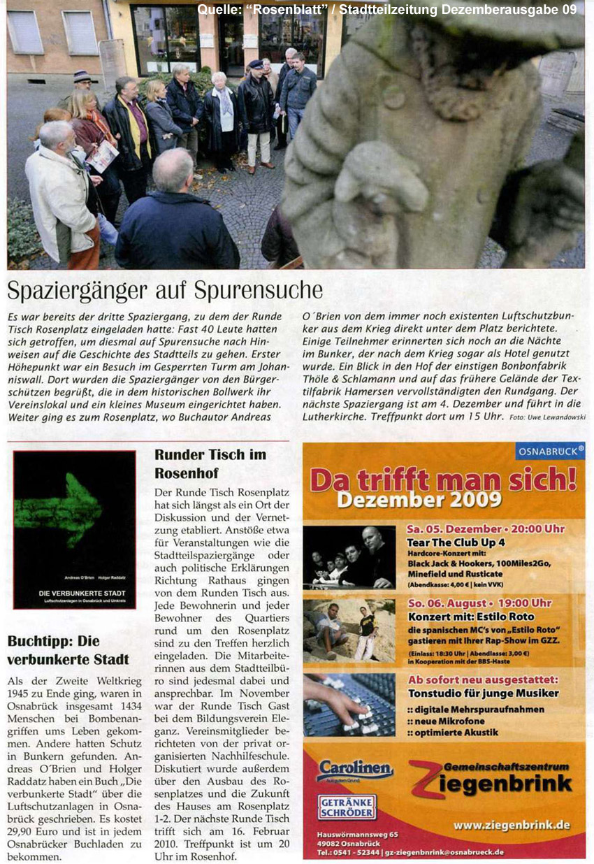 Ein Artikel zum Stadtteilspaziergang vom 23.10.09 erschien nun in der Dezemberausgabe der Stadtteilzeitung "Rosenblatt": Hier