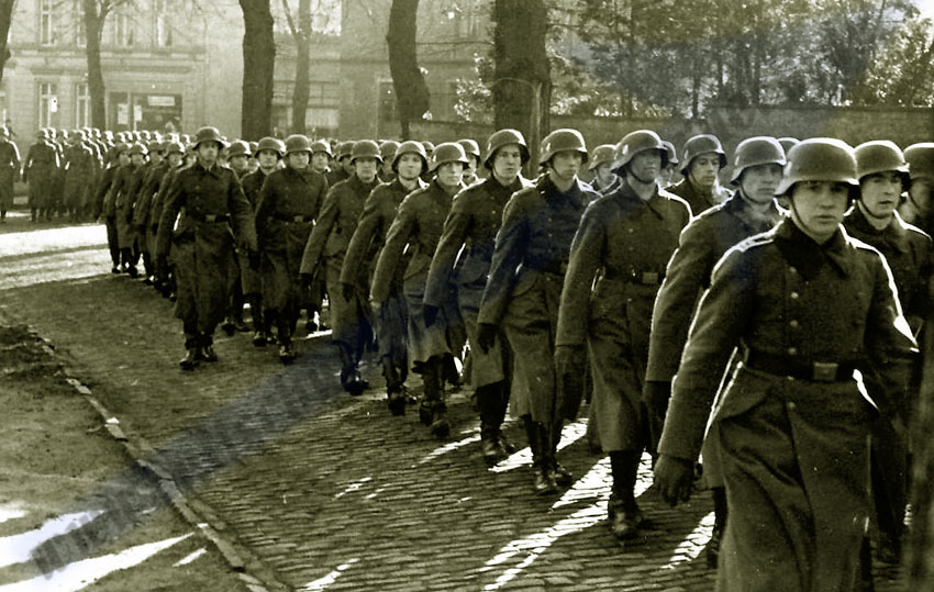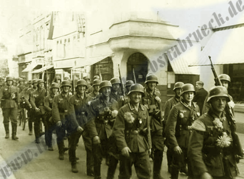 August 1939, kurz vor Kriegsbeginn: Truppen marschieren durch die Osnabrücker Innenstadt in Richtung Hauptbahnhof zur Verlegung an die westliche Reichsgrenze. Hier