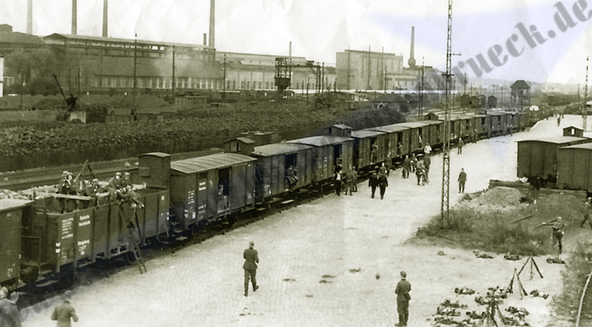 Dieses Bild wurde im August 1939 auf dem Osnabrücker Güterbahnhof fotografiert. Truppenteile des Heeres werden aufgrund der Mobilmachung in Richtung Westwall verlegt. Hier