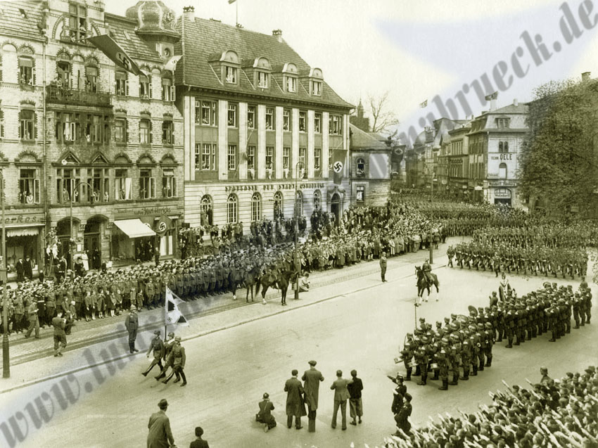 Dieses Foto entstand zu Kriegszeiten in Osnabrück an der Friedrichstraße. Im Hintergrund verläuft die Lotter Straße. Parade auf dem Osnabrücker Neumarkt zum "Führergeburtstag" am 20. April 1937.