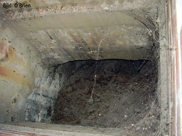 Dieser Mauerblock befindet sich vor einem Kellerfenster in der Nähe der Pfeile. Er könnte etwas mit LS-Zwecken zu tun gehabt haben, obwohl das Mauerwerk jedoch neueren Datums zu sein scheint. Blick in den Schacht zum Fenster: