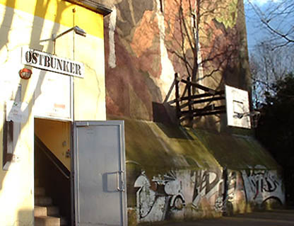 Der Hochbunker (eckiger Luftschutzturm) an der Oststraße, auch "Ostbunker" genannt, besitzt sechs Stockwerke, die durch zwei Splitterschutzeingänge erreicht werden können. Erbaut wurde er in der so genannten "ersten Bauwelle" ab Januar 1941. Fertig gestellt war der Bau im Frühjahr 1943. Geplant für 483 Personen wurden hier in Kriegszeiten bis zu 2000 Menschen gezählt. Auf dem Dach war zusätzlich eine Zwillingsflak zur Luftabwehr befestigt. Der Schacht des Munitionsaufzugs und der mutmaßliche ehemalige Zugang zum Dach existieren noch heute, dienen aber nun dem Heizungssystem. Die Stärke der Außenwand steigt von oben nach unten kegelförmig von 80 cm auf 1,20 m an. Die Innenräume der sechs Stockwerke waren damals in viele kleine "Kammern" mit einer Grundfläche von etwa 2,5 x 2,5 Metern unterteilt, die über zwei Zugänge vom Treppenhaus erreichbar waren. Vom Treppenhaus in der Mitte des Bunkers kam man in einen Flur, an den sich die Kammern anschlossen. Heute zeugen noch "Narben" auf dem Fußboden an einigen Stellen von der alten Unterteilung. Die schwarzen Fliesen, die sich überall finden, sind im übrigen alle original!
