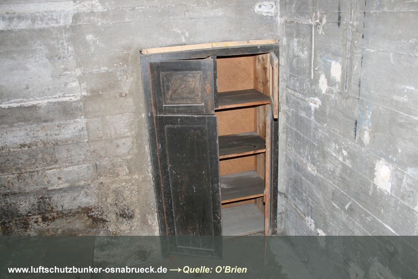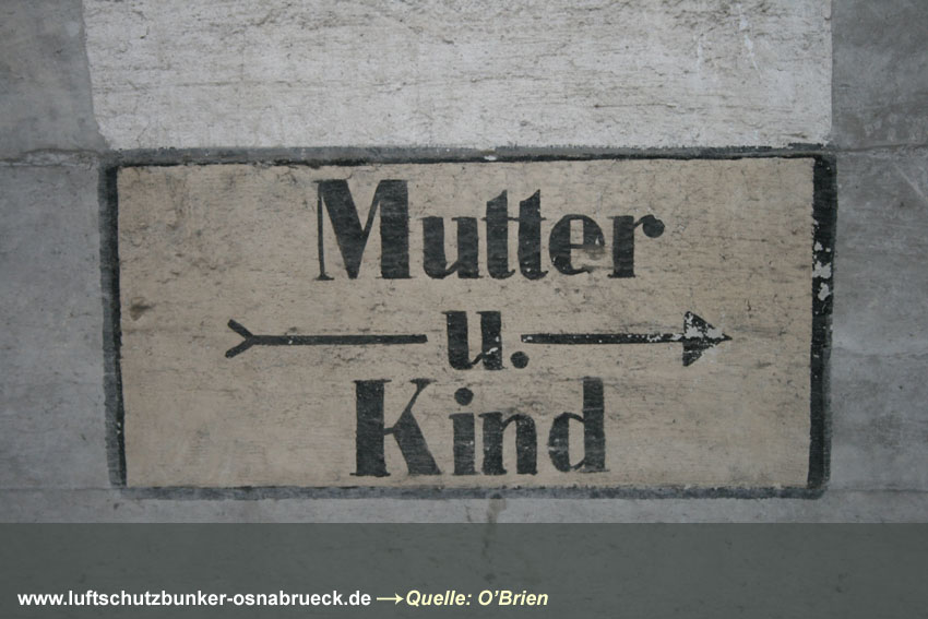 Ein Schriftzug in englisch und deutsch. Trotz Kriegszustand zwischen England und Deutschland wurde in diesem Bunker zweisprachig zu den Mutter- und Kindschutzräumen hingewiesen. Da dies ein Reichsbahnbunker war, sind die Hinweise international lesbar gehalten gewesen: