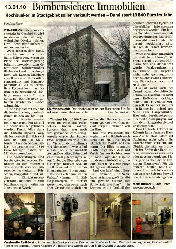 Bericht zur Osnabrücker Hochbunkerveräußerung in der "NOZ" vom 13.01.10: