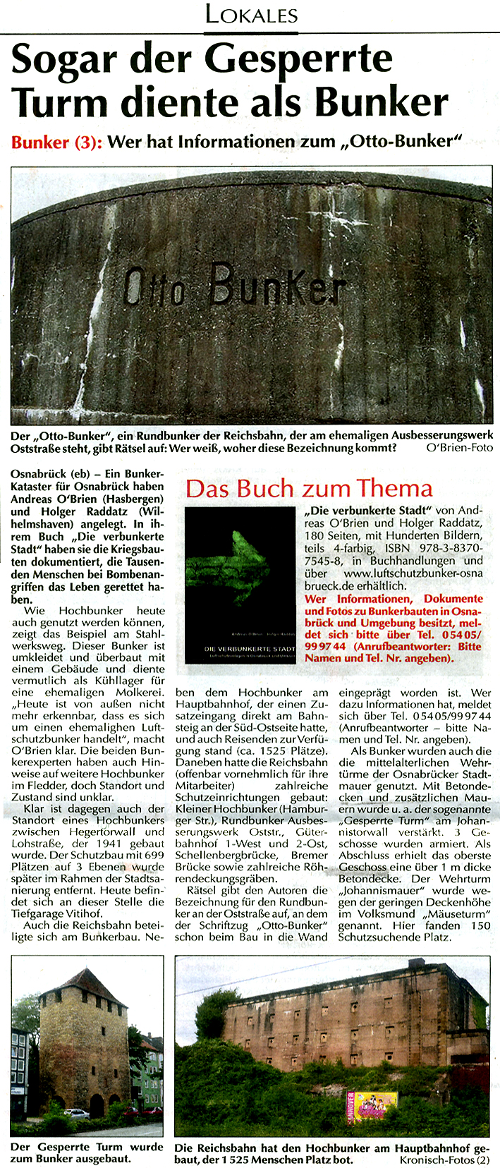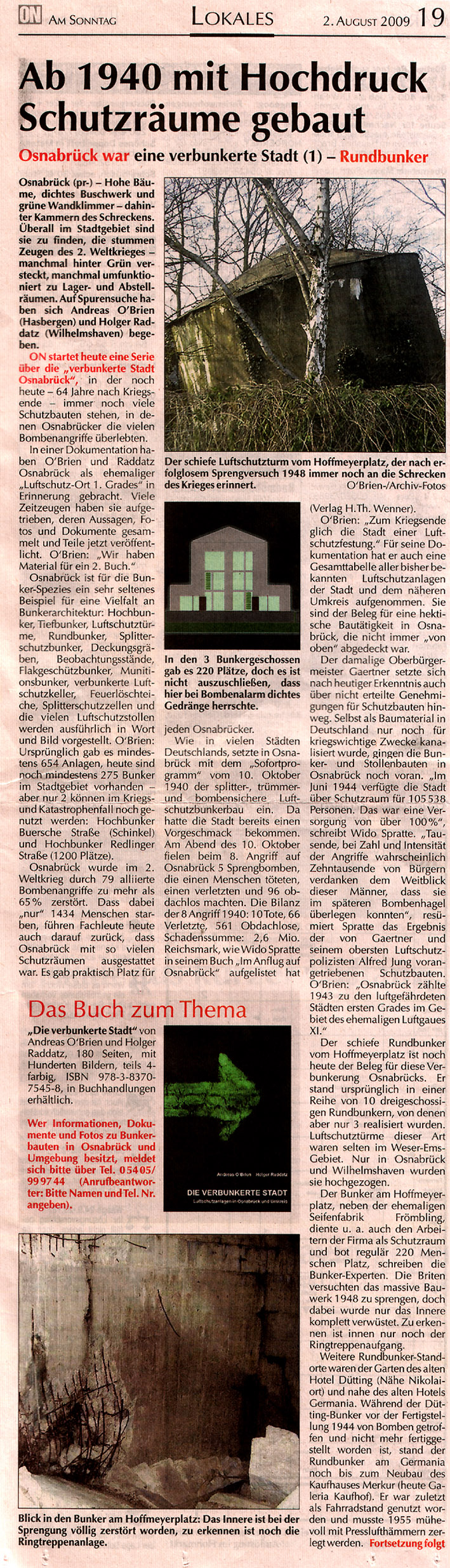 Neue Serie über Bunker in Osnabrück in der "ON" / Vorstellung des Buches "Die verbunkerte Stadt" / Teil 2 "Hochbunker" vom 09.08.09: