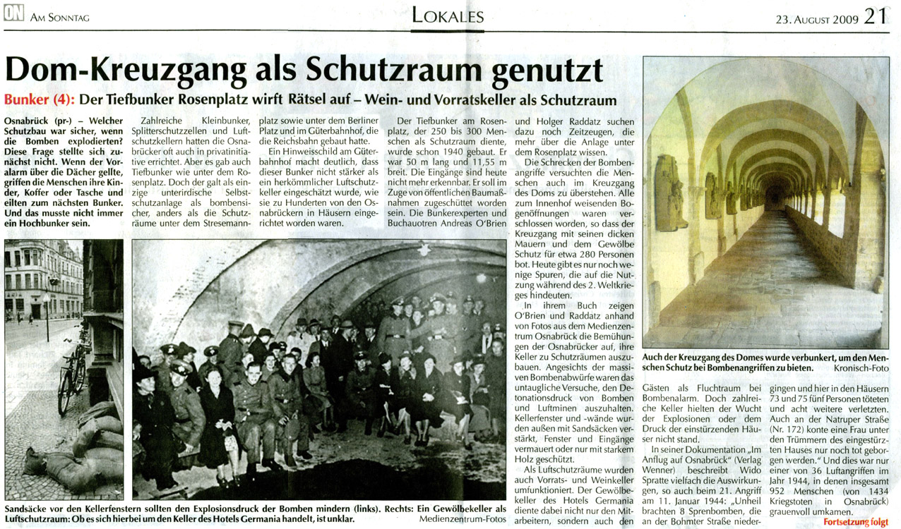 Neue Serie über Bunker in Osnabrück in der "ON" / Teil 4 "Der Tiefbunker Rosenplatz wirft Rätsel auf ..." vom 23.08.09: