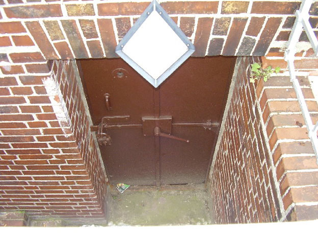 Ersichtlich sind vermauerte Kellerfenster und eine Stahltür. Wer besitzt