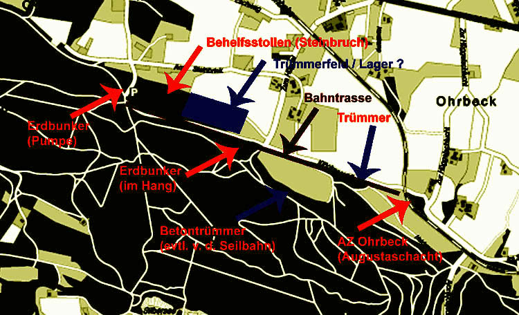 Im Gebiet Ohrbeck, Bereich ehemaliges Lager HÜGGEL 2 (das Lager Hüggel 2 war das Russenlager, Lager 1 das der Niederländer), befindet sich ein Betontrümmerfeld von der Größe eines Fußballfeldes. Was war das? Stammen die Trümmer vom Lager HÜGGEL 2? Zusätzliche Trümmer befinden sich weiter südlich. Sie könnten von einer alten Seilbahnanlage stammen. Weiter östlich an der Bahntrasse befinden sich ebenfalls Trümmer. Wer weiß etwas zu diesem Gebiet, wer besitzt Infos?