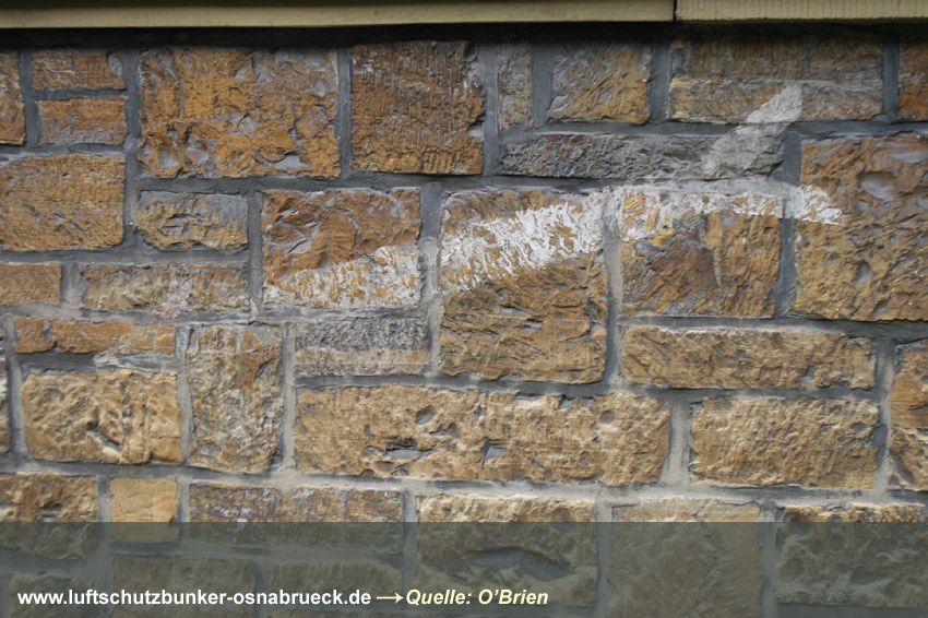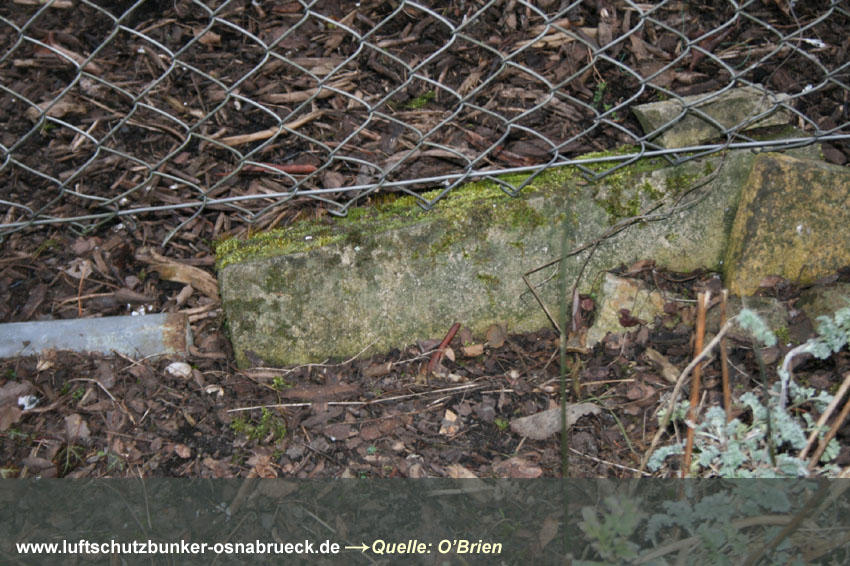 Einfacher, äußerlich nicht sichtbar verbunkerter LS-Keller im Stadtteil Wüste in Osnabrück (in Tabelle nicht aufgelistet). Interessant sind wieder die Steigeisen am Notausstieg und die Türen aus Massivholz. Betontrümmer im Freien am Keller könnten Reste von Stahlbeton-Schutzblenden der Fenster darstellen. Auch ein Pfeil ist noch an der Gebäudewand zu sehen. Erhalten
