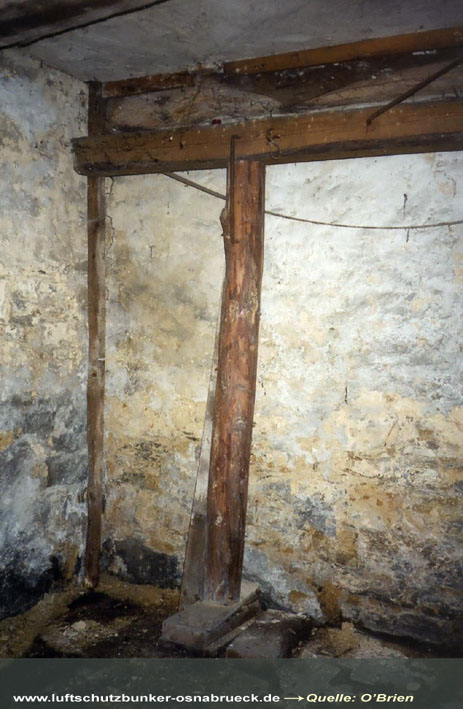 Einfacher, äußerlich nicht sichtbar verbunkerter LS-Keller in der Kokschen Straße (im Stadtteil Wüste) in Osnabrück. Die zur Abstützung dienenden Holzstämme wurden 2007 während einer Komplettsanierung des Kellers entfernt (in Tabelle nicht aufgelistet). Keller erhalten / LS-Relikte entfernt