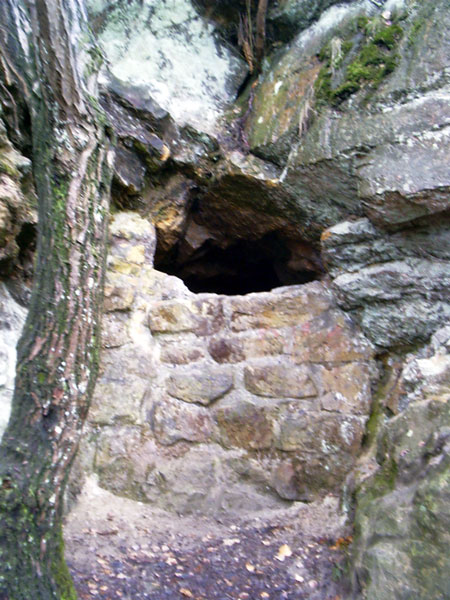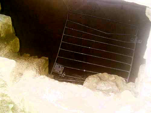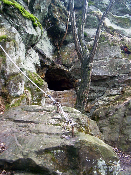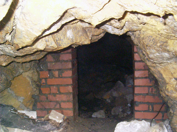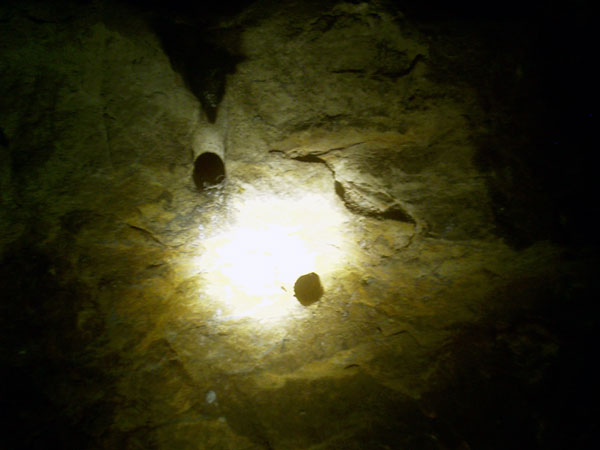 Hinter dem beleuchteten Vorsprung geht der Stollen links ab