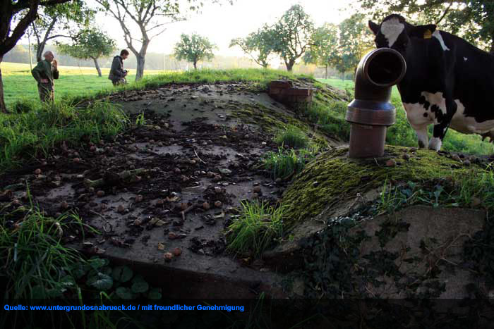 Dieser private Erdbunker ist augenscheinlich bis heute sehr gut erhalten geblieben. Interessant ist das abgewinkelte Lüftungsrohr auf dem Bunkerdach.